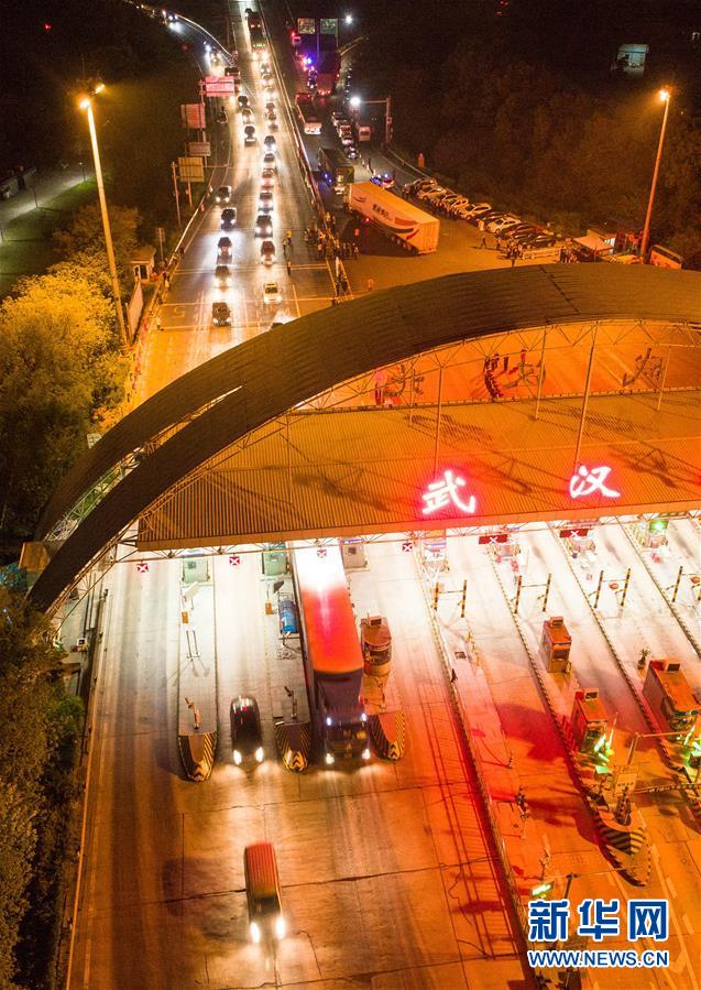4月8日凌晨,车辆通过武汉北高速收费站(无人机照片)。 新华社记者 肖艺九 摄