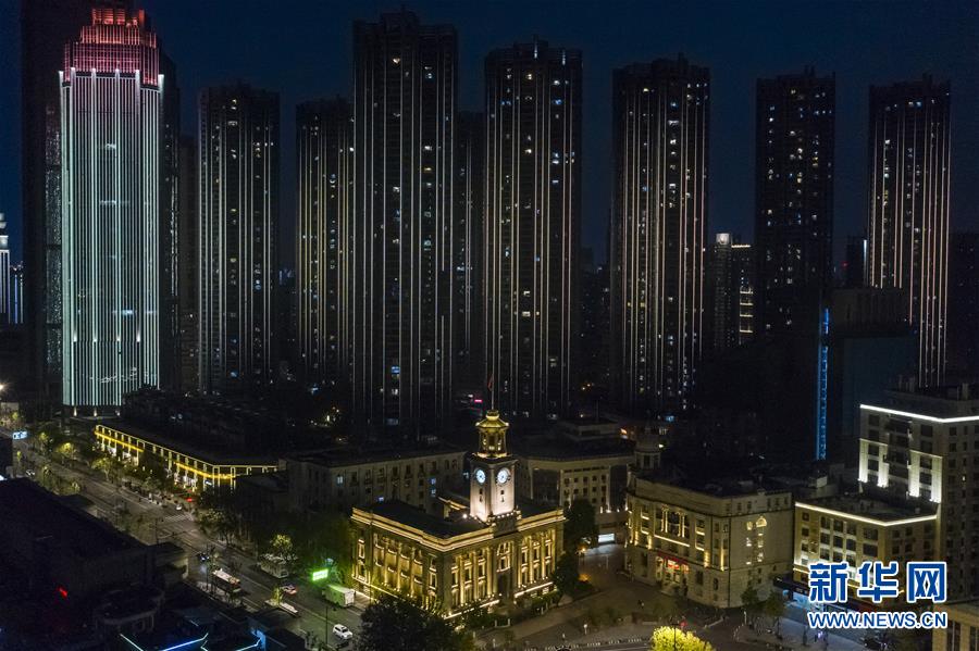 这是4月7日晚拍摄的武汉市江汉关博物馆及附近建筑灯光夜景(无人机拍摄)。新华社记者沈伯韩摄