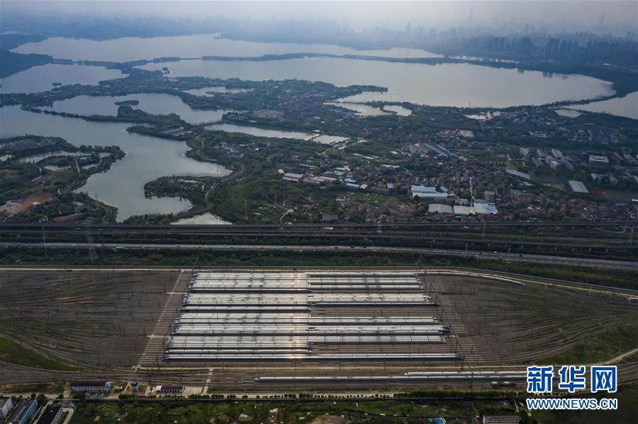 4月7日,在武汉动车段,列车停靠在存车线上(无人机照片)。