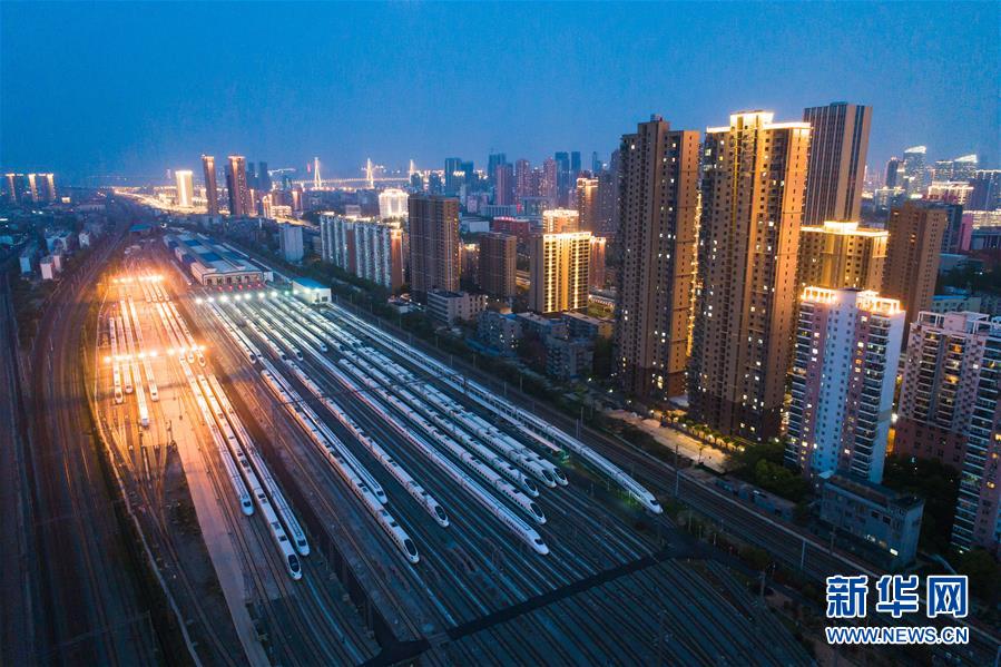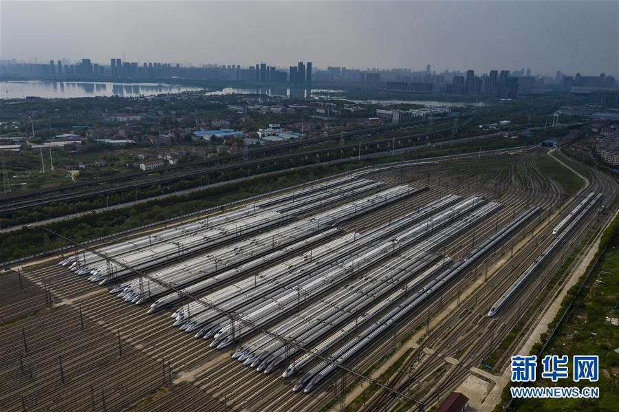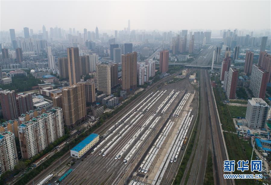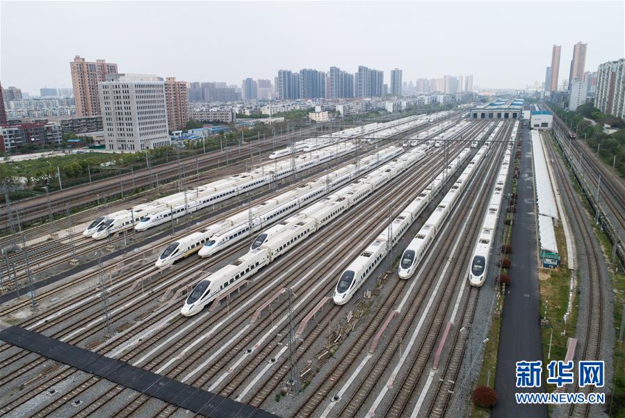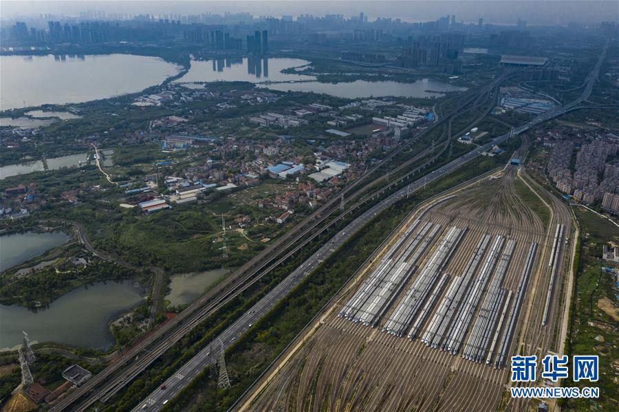 4月7日,在武汉动车段,列车停靠在存车线上(无人机照片)。 新华社记者 肖艺九 摄