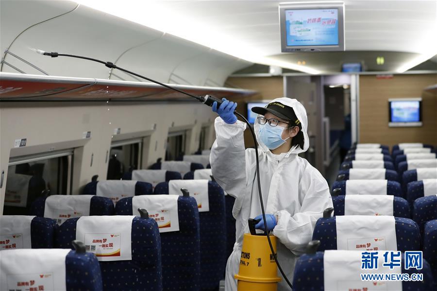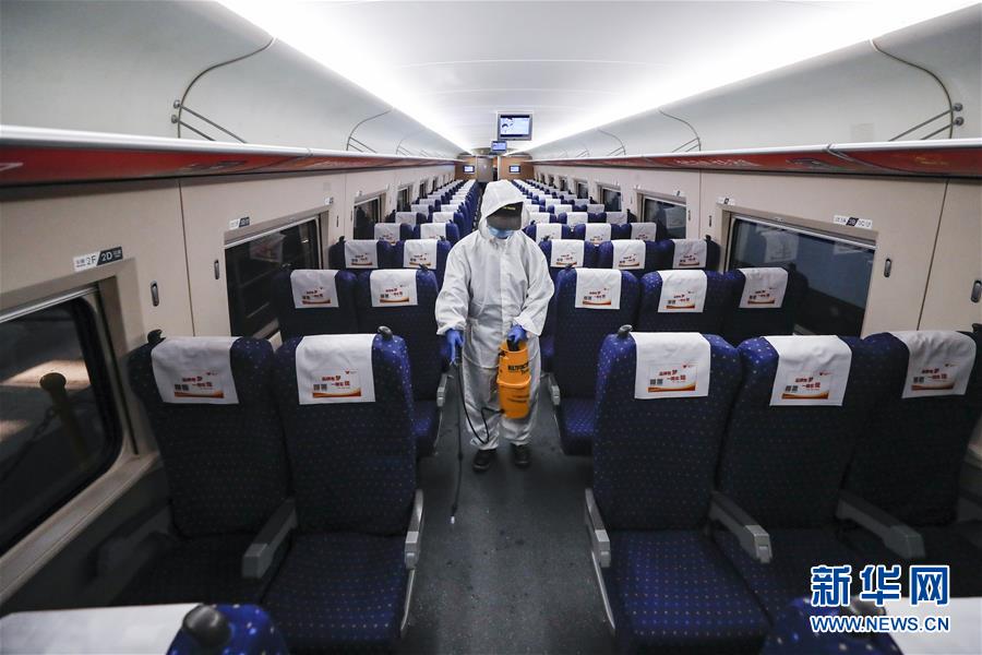 4月7日,武汉动车段运用车间工作人员周明辉在给列车消毒。 新华社记者 沈伯韩 摄