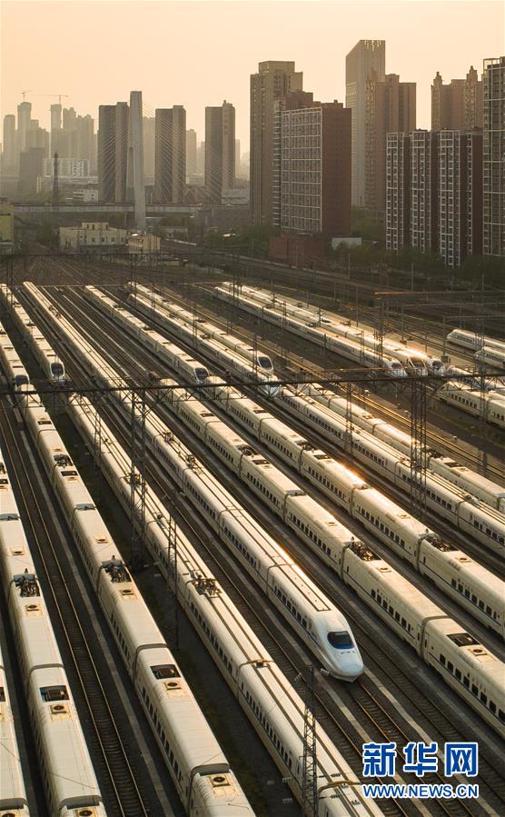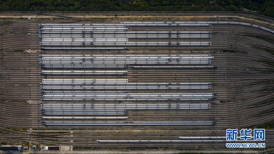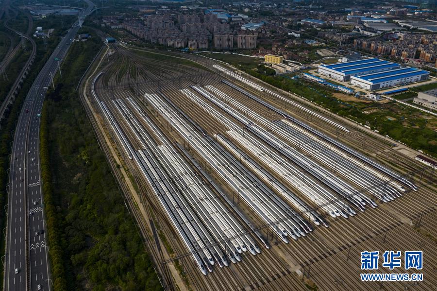 4月7日,在武汉动车段,列车停靠在存车线上(无人机照片)。