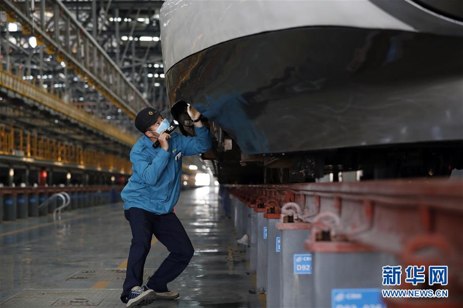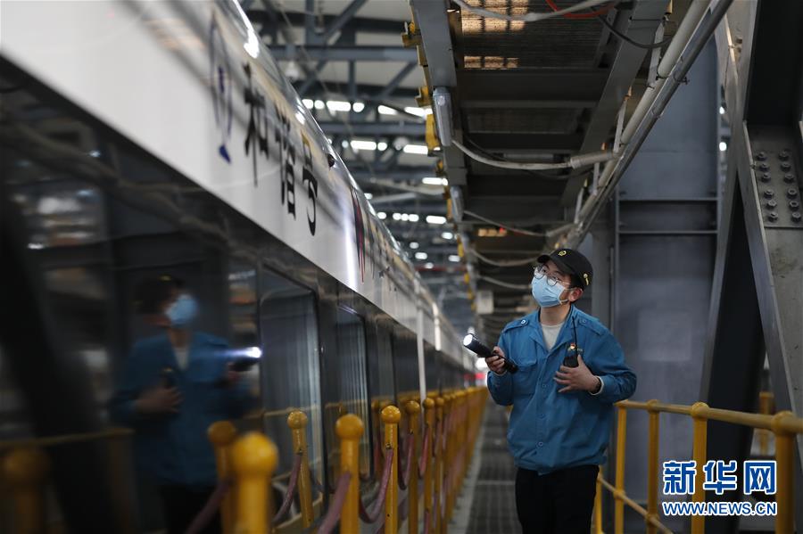 4月7日,武汉动车段运用车间综合检修班工长杨磊在检查车辆情况。 新华社记者 沈伯韩 摄