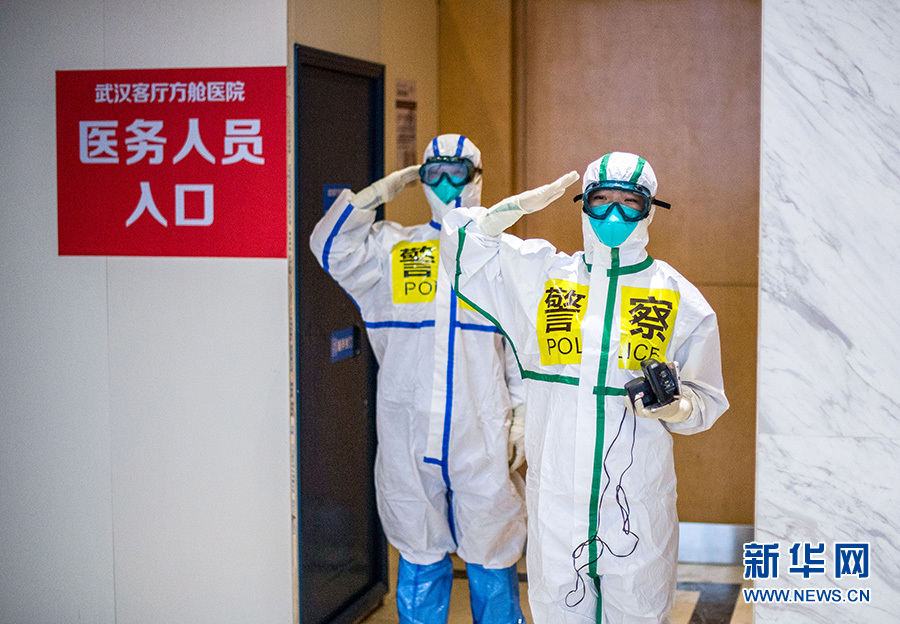 2月25日,在武汉客厅方舱医院,来自武汉市东西湖区公安分局的民警张锦星(右)与同事刘晨在进方舱前向同事敬礼。 新华社记者 肖艺九 摄