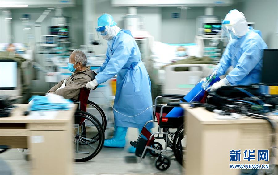 3月20日,武汉火神山医院重症医学一科副主任宋立强(中)护送81岁的新冠肺炎重症患者去做CT检查。为确保患者有充足供氧,医生胡世颉推着氧气瓶随行。 新华社记者 王毓国 摄
