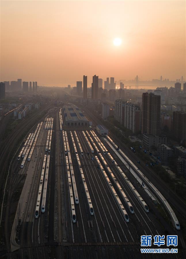 4月8日,在武汉动车段,列车停靠在存车线上准备投入运行(无人机照片)。当日,武汉市正式解除离汉离鄂通道管控措施,几十组在武汉动车段经过检修消杀的动车组,犹如“陆地舰队”停靠在存车线上,蓄势待发,重新启程。 新华社记者 肖艺九 摄