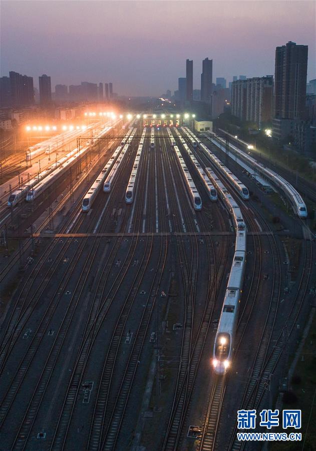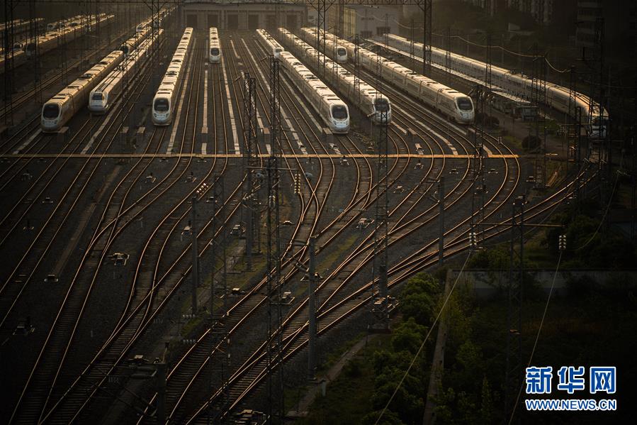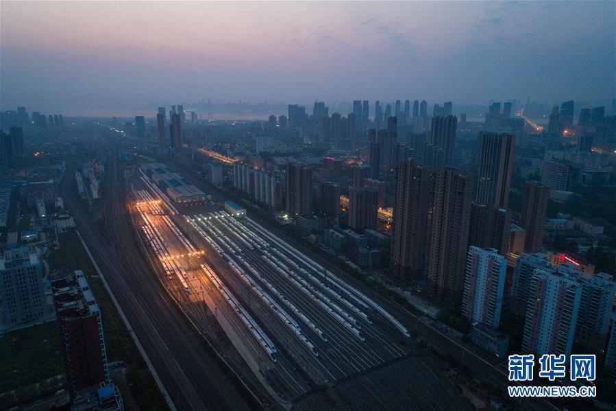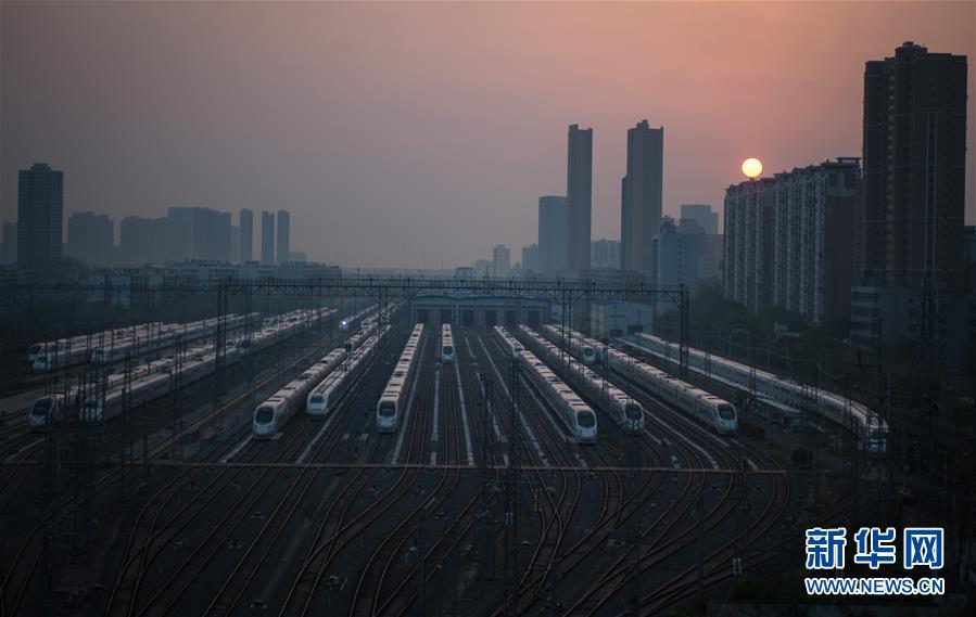 4月8日,在武汉动车段,列车停靠在存车线上准备投入运行。 新华社记者 肖艺九 摄