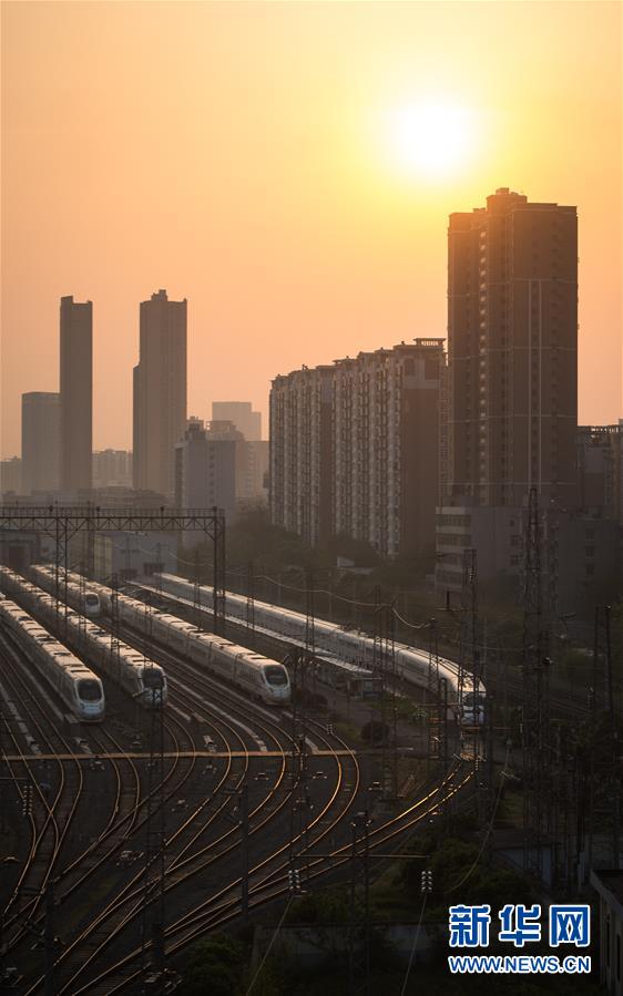 4月8日,在武汉动车段,列车停靠在存车线上准备投入运行。 新华社记者 肖艺九 摄
