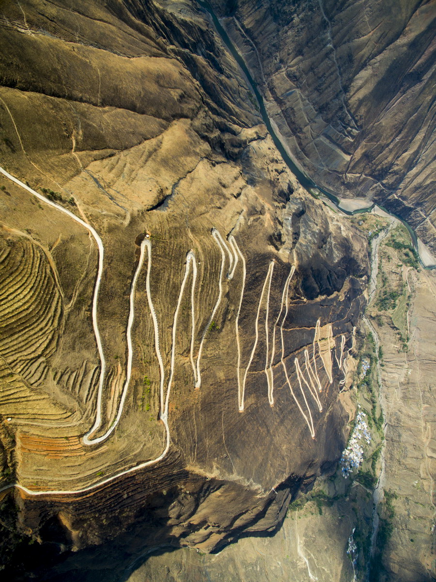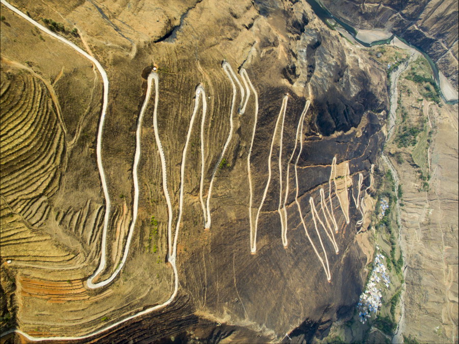 这是“怒江72拐”,该处位于西藏自治区昌都市八宿县境内,是川藏线上一段艰险与美景并存的山路(10月23日无人机拍摄)。全长2000多公里的川藏公路,从成都开始,一路向西到终点拉萨,在横断山脉、喜马拉雅山脉和念青唐古拉山脉间蜿蜒盘旋,因海拔落差大,弯道众多,形成天路奇观。川藏公路1954年12月25日通车,65年来,国家对川藏公路进行了大规模改造升级,建设了众多桥梁和隧道,行车条件得到明显改善。新华社记者江宏景摄