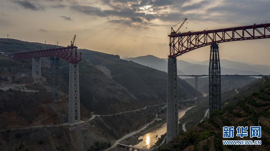4月8日清晨,工人在中老铁路元江特大桥上进行钢桁梁架设作业(无人机照片)。4月7日,中老铁路全线重点控制性工程——元江特大桥迎来关键节点,主桥钢桁梁正式“迈”过154米高的主桥墩,这是世界同类铁路桥梁第一高墩。元江特大桥位于云南省元江县,采用上承式连续钢桁梁跨越峡谷,全长832.2米,建成后,其249米的主跨也将刷新国内同类桥梁跨度纪录。新华社记者江文耀摄