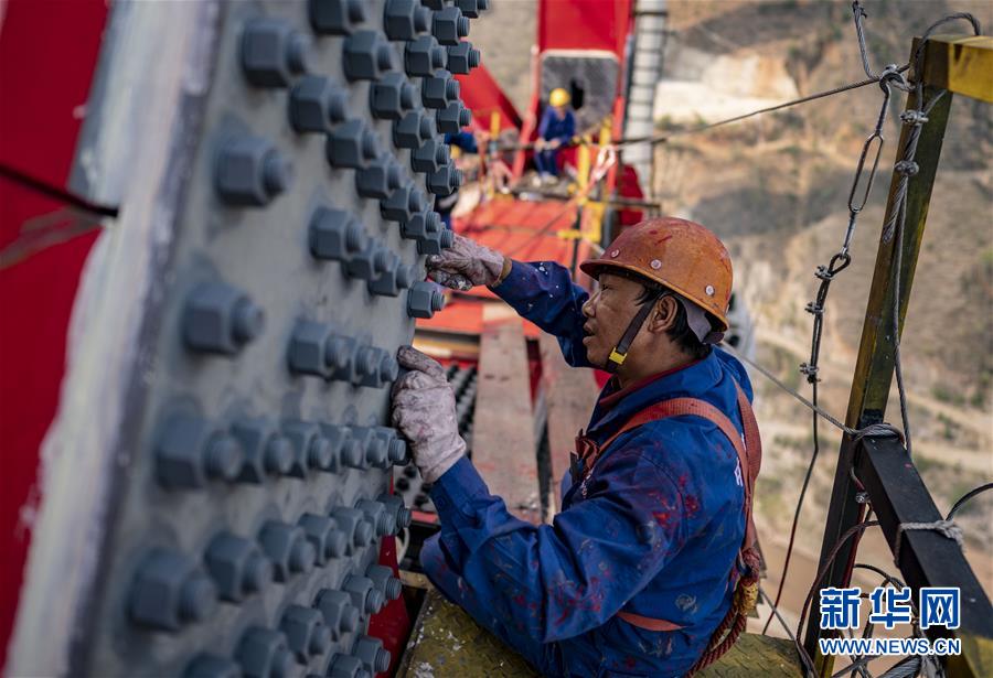 4月8日,来自湖北鄂州的中铁四局工人熊学良进行钢桁梁架设作业。新华社记者江文耀摄
