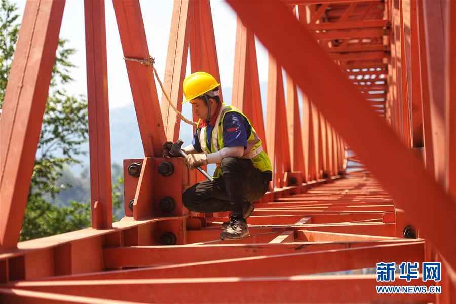 在位于普洱市的木乃河双线特大桥工程现场,工人钟琪在检查螺丝紧固情况(4月12日摄)。新华社记者秦晴摄