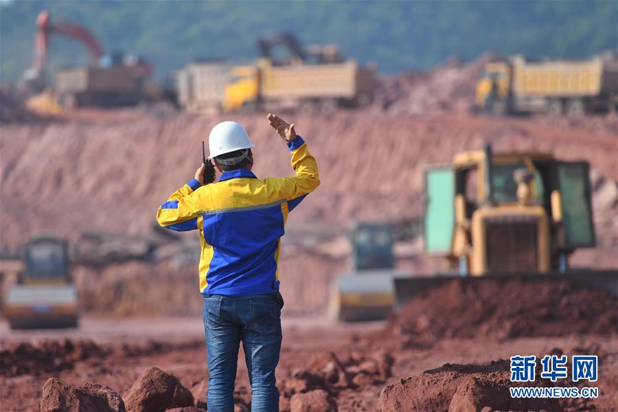 普洱车站施工现场,中铁八局的工人在指挥压路机碾压路面(4月12日摄)。新华社记者秦晴摄