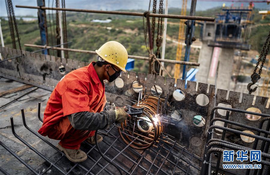 3月5日,工人在中老铁路南溪河特大桥上施工。新华社记者江文耀摄
