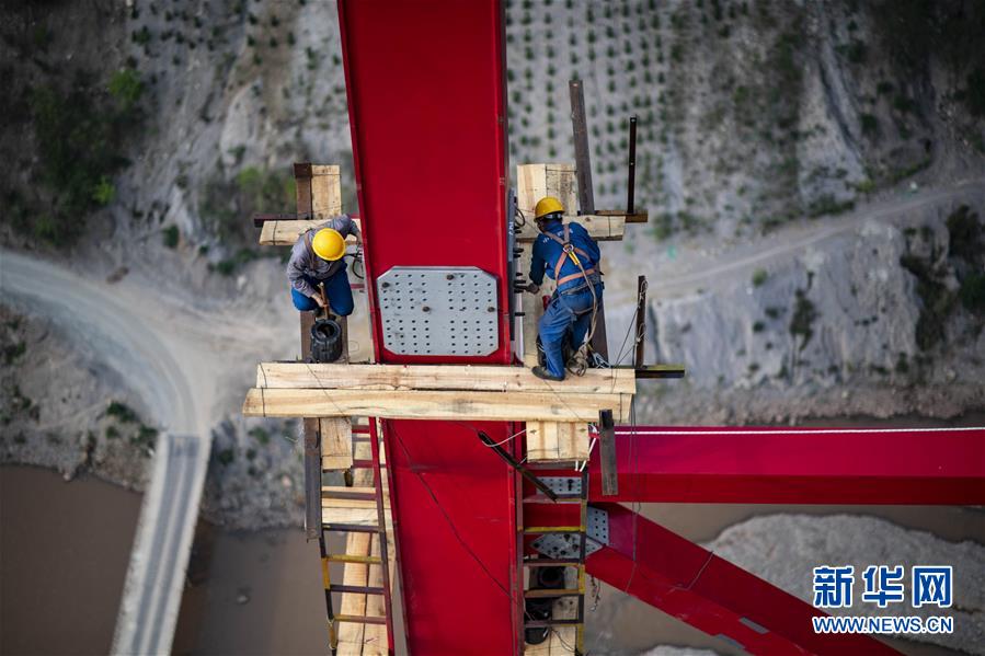 4月8日,两名中铁四局职工安装架设钢桁梁,每节钢桁梁间的精度需要达到毫米级才能保证安装到位。新华社记者江文耀摄