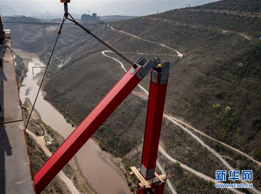 4月8日,来自湖北鄂州的中铁四局工人熊学良进行钢桁梁架设作业。新华社记者江文耀摄