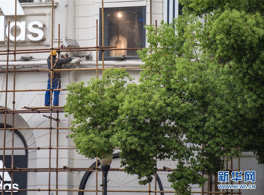 4月8日,在江汉路步行街,工人在施工。新华社记者肖艺九摄