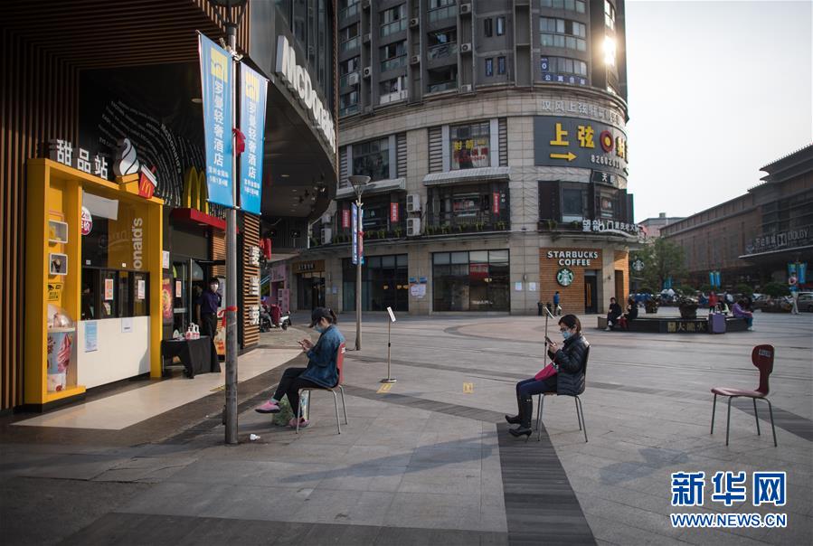 4月8日,顾客在江汉路步行街一家甜品店门前排队。新华社记者肖艺九摄