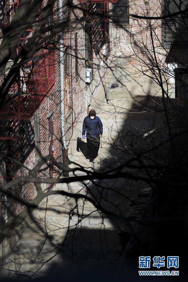 4月1日,在美国纽约,居民在一处住宅楼的院子里散步。新华社记者王迎摄
