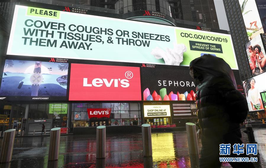 3月23日,在美国纽约时报广场,大屏幕上播放防控新冠肺炎的知识。新华社记者王迎摄