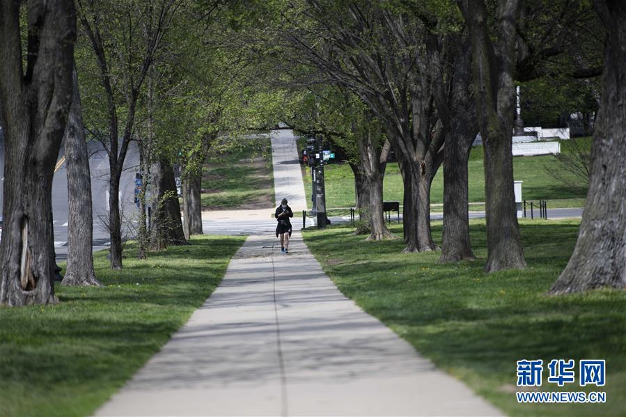 4月8日,在美国首都华盛顿,一名戴口罩的男子行走在空旷的步行道上。新华社记者刘杰摄