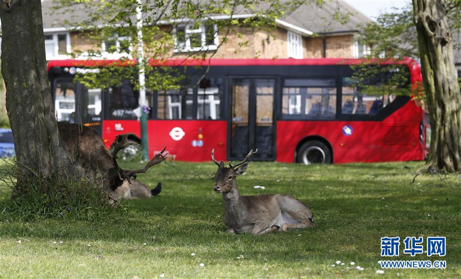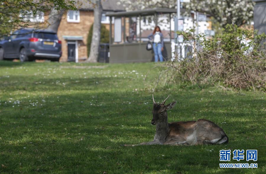 4月8日,在英国伦敦东部一个居民区,附近公园里的鹿在草坪上休息。随着新冠疫情在英国的扩散,政府要求人们减少不必要的外出。伦敦东部一个居民区附近公园里原来散养的鹿纷纷从公园走出来,或吃草或接受附近居民的喂食,成为特殊时期居民区里的新“客人”。新华社记者韩岩摄