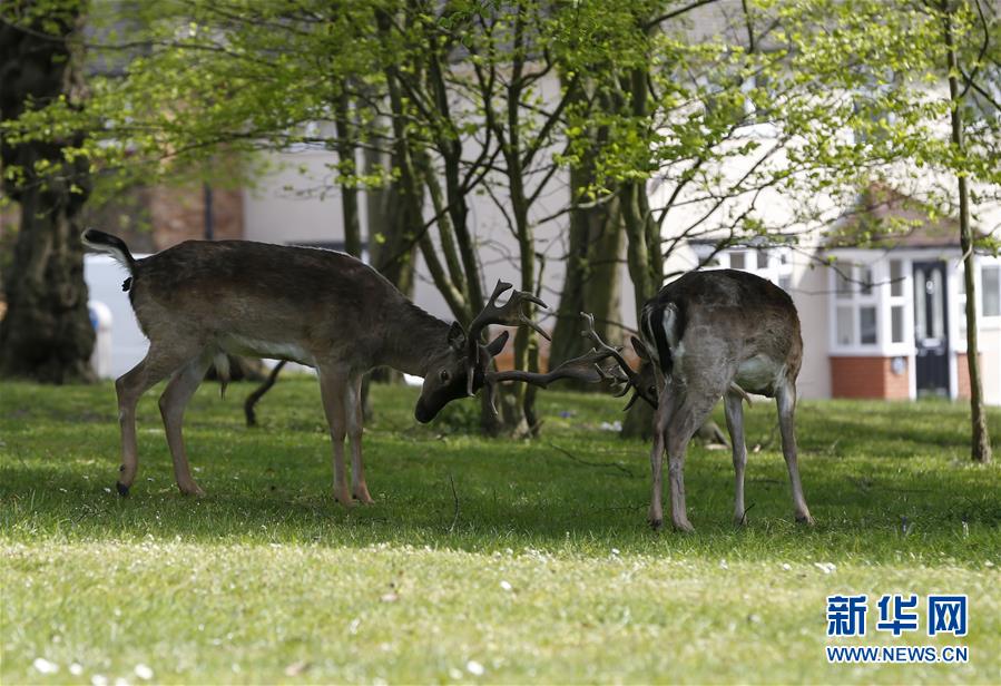 4月8日,在英国伦敦东部一个居民区,附近公园里的鹿在草坪上驻足。随着新冠疫情在英国的扩散,政府要求人们减少不必要的外出。伦敦东部一个居民区附近公园里原来散养的鹿纷纷从公园走出来,或吃草或接受附近居民的喂食,成为特殊时期居民区里的新“客人”。新华社记者韩岩摄