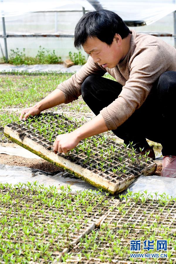 4月13日,在洛南县麻坪镇三兴村辣上天育苗合作点,村民张红在检查育苗情况。新华社记者陶明摄