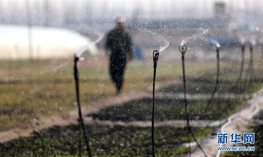 4月13日,在八角台街道雅化村,一处刚刚培育的花圃进行灌溉。