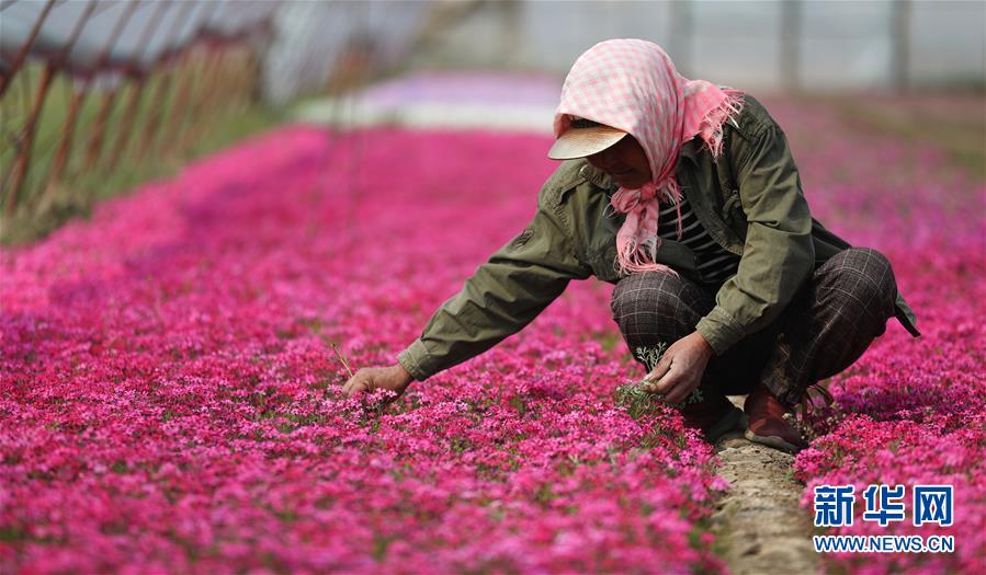 4月13日,在八角台街道雅化村花圃内,花农为培育的宿根花卉除草。新华社记者姚剑锋摄