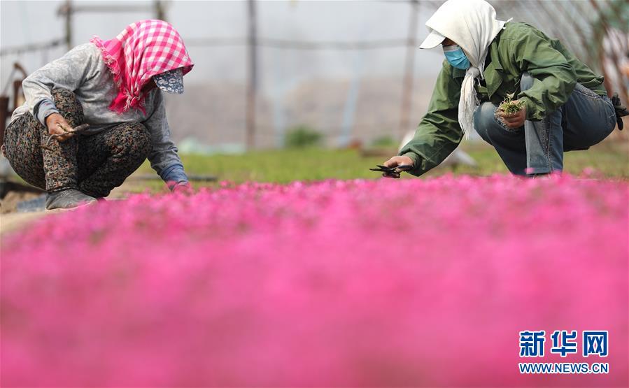 4月13日,在八角台街道雅化村花圃内,花农为宿根花卉除草。新华社记者姚剑锋摄