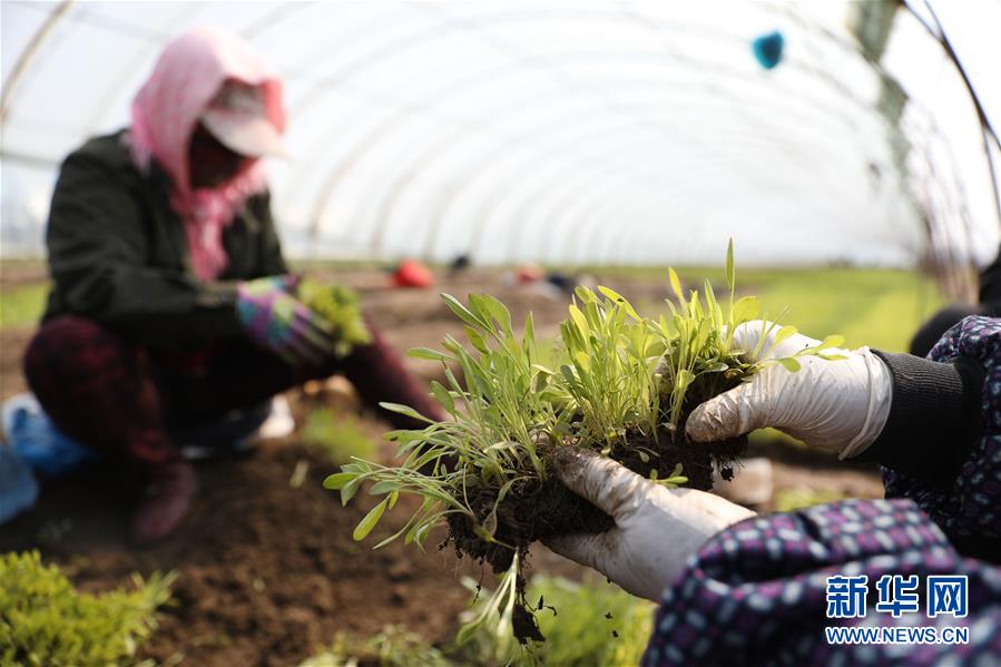 4月13日,花农在八角台街道雅化村一块花圃内分拣培育好的花苗。新华社记者姚剑锋摄