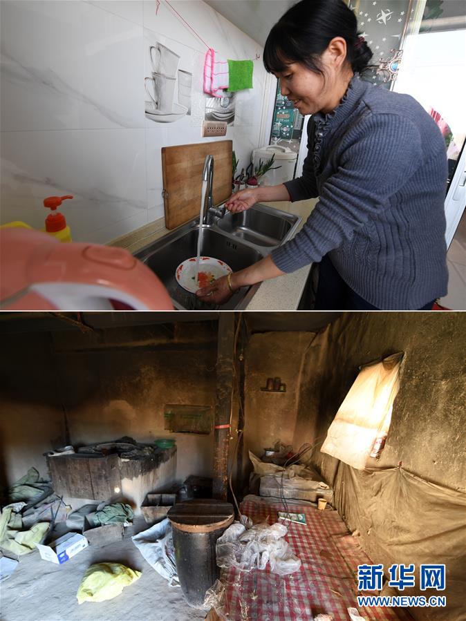 拼版照片:上图为胥存在古浪县绿洲生态移民小城镇的家中厨房忙碌(4月7日摄);下图为胥存在古浪县黄羊川镇石城村的家中厨房(2018年2月6日摄)。新华社记者范培珅摄