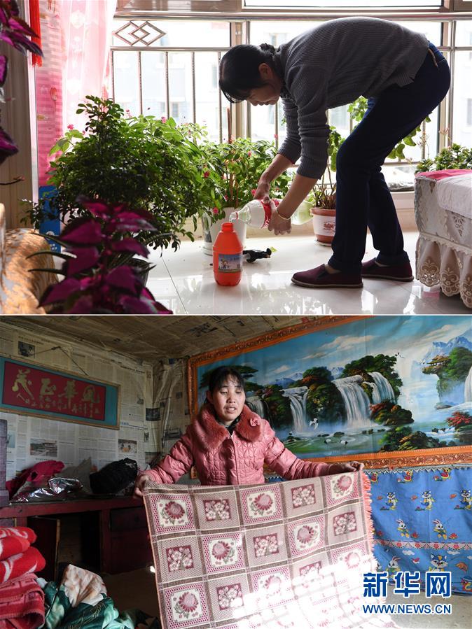 拼版照片:上图为胥存在古浪县绿洲生态移民小城镇的家中给客厅里的花浇水(4月7日摄);下图为胥存在古浪县黄羊川镇石城村的家中叠床单(2018年2月6日摄)。新华社记者范培珅摄