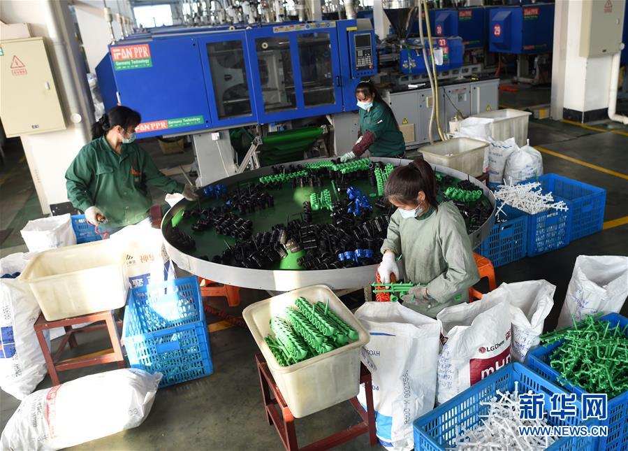 4月13日,员工在位于店口镇的诸暨市风帆管业有限公司注塑车间分拣自动化生产线上的管件。新华社记者韩传号摄