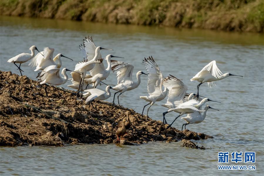 这是在福建闽江口湿地拍摄的黑脸琵鹭(4月12日摄)。新华社记者梅永存摄