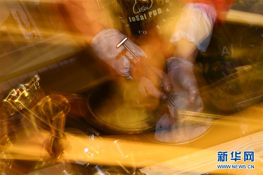 4月8日,才仁俄赛在餐厅内制作调酒使用的冰块。新华社记者张宏祥摄