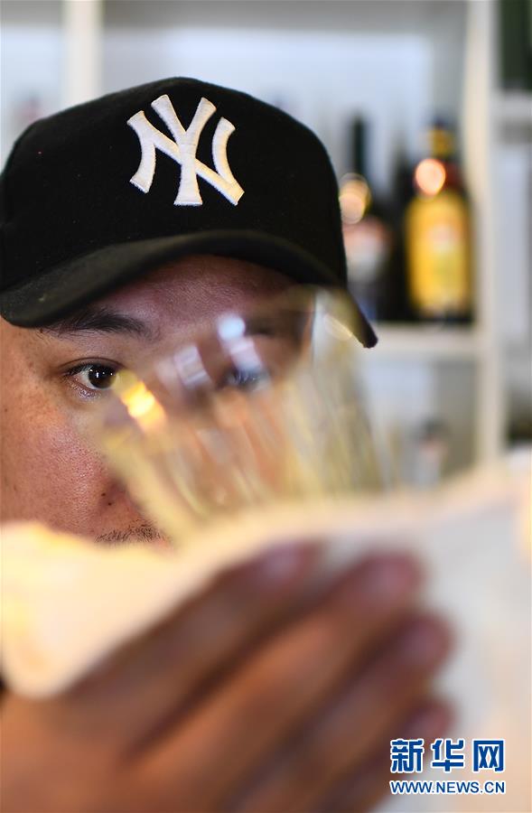 4月10日,才仁俄赛在餐厅中擦拭酒杯。新华社记者张宏祥摄