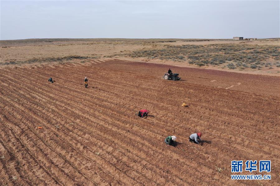 4月15日,农民在杭锦旗道劳呼都格嘎查的农田里播撒红葱苗。春种时节,在内蒙古鄂尔多斯市杭锦旗道劳呼都格嘎查,农民忙着播种红葱。在鄂尔多斯高原种植的红葱耐旱耐寒,具有较好的经济效益。新华社记者徐钦摄