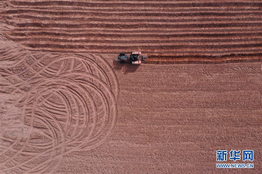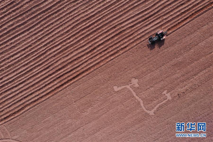 4月15日,农民操作机械在杭锦旗道劳呼都格嘎查的农田里翻地,为种植红葱做准备(无人机照片)。春种时节,在内蒙古鄂尔多斯市杭锦旗道劳呼都格嘎查,农民忙着播种红葱。在鄂尔多斯高原种植的红葱耐旱耐寒,具有较好的经济效益。新华社记者徐钦摄