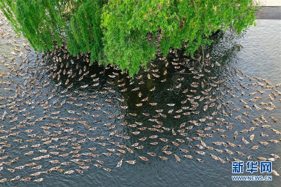 这是4月15日在高邮鸭良种繁育中心拍摄的鸭群(无人机照片)。“高邮鸭蛋”是江苏高邮的特色农业名片。近年来,当地在良种繁育、生态养殖、产品加工等方面加大力度,推动高邮鸭蛋品牌化建设,让小鸭蛋成为带动农户致富的大产业。2019年,高邮市共计生产熟制鸭蛋产品近11.2亿枚,年产值近17.68亿元。新华社记者季春鹏摄