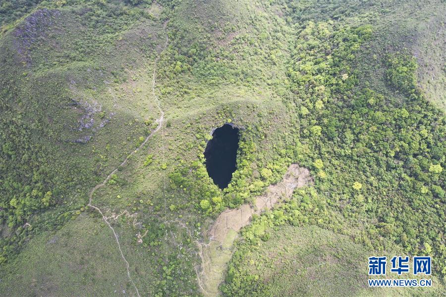 这是4月19日拍摄的中国乐业—凤山世界地质公园内的天坑(无人机照片)。新华社记者曹祎铭摄