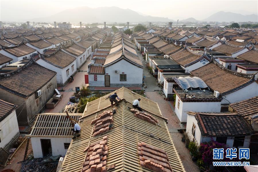 11月14日,埭美村村民在修缮一座古民居(无人机拍摄)。新华社记者姜克红摄