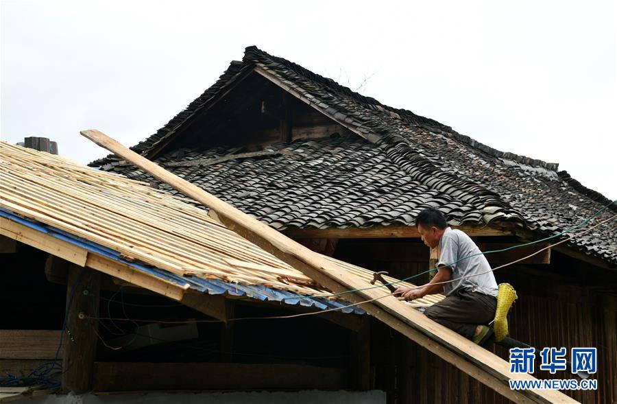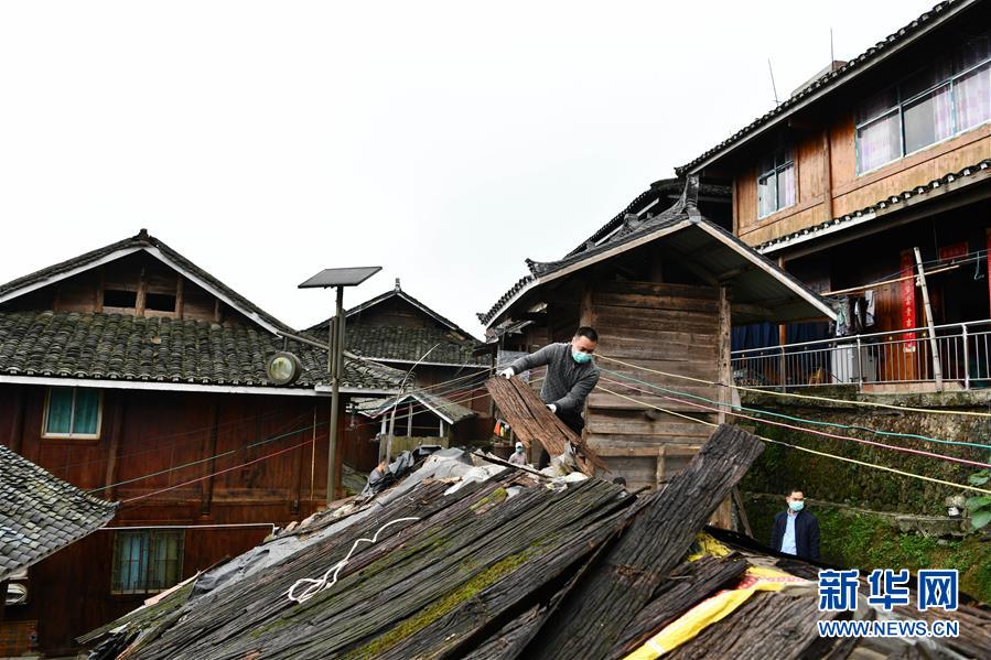 贵州省从江县加榜乡党扭村村民在整治吊脚楼风貌(4月16日摄)。贵州省从江县把人居环境整治作为脱贫攻坚工作的一项重要举措来抓,对乡村规划范围内长期无人居住的危房、废弃禾仓、棚圈、柴草房和房前屋后的残垣断壁等进行清理整治,进行复垦复绿,同时开展农户卫生和村寨环境整治,做到乡村环境干净、卫生、整洁,扮靓美丽乡村。新华社记者杨文斌摄