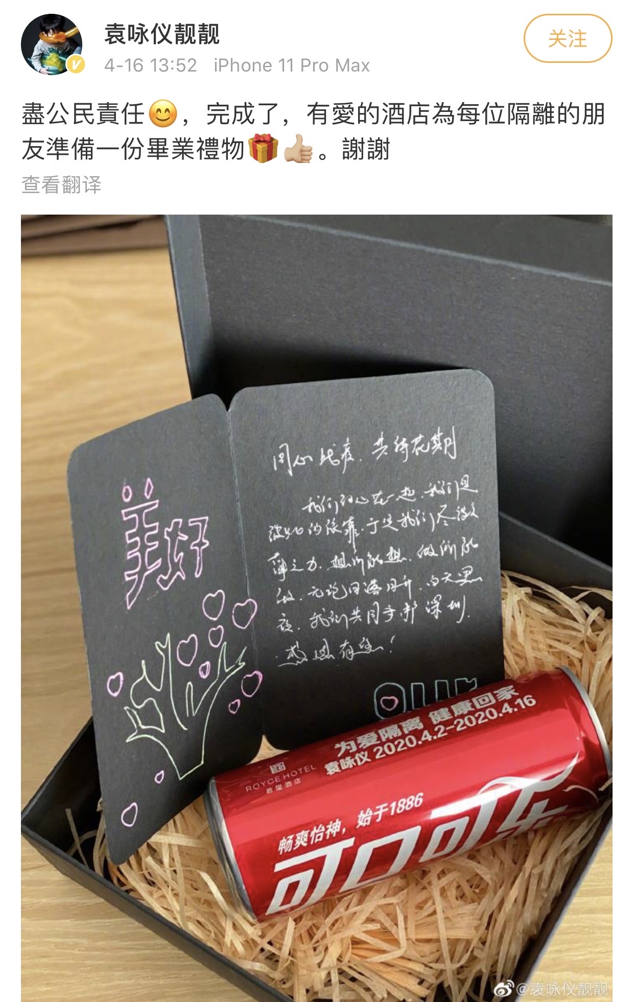 近日,香港艺人袁咏仪发了一条微博,晒出了一份特别的“毕业礼物”,这是深圳一酒店为每位结束隔离的公民准备的,除了有一瓶“为爱隔离、健康回家”的饮料,还有一张“同心战疫、共待花期”的暖心贺卡。