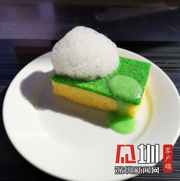 洗碗海绵形状的蛋糕。其实是橄榄油蛋糕,上面撒上薄荷面包屑,再配上牛奶泡沫和苹果泥。