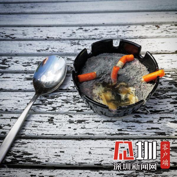 “烟灰缸”奶酪。烟灰缸内放置着瓦尼拉蔓越莓慕斯,巧克力还有蛋白粉末制作的烟头烟灰。