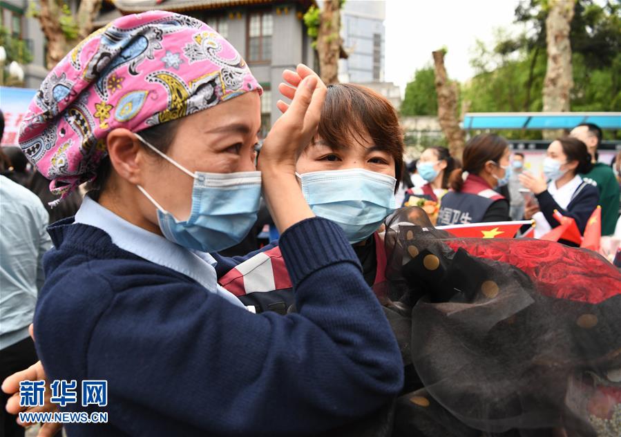 4月21日,在四川大学华西医院,医疗队队员安慰流泪的同事。当日,来自四川大学华西医院、华西第二医院、华西第四医院的医疗队队员解除隔离休整,与分别许久的家人、同事团聚,紧紧相拥。新华社记者王曦摄