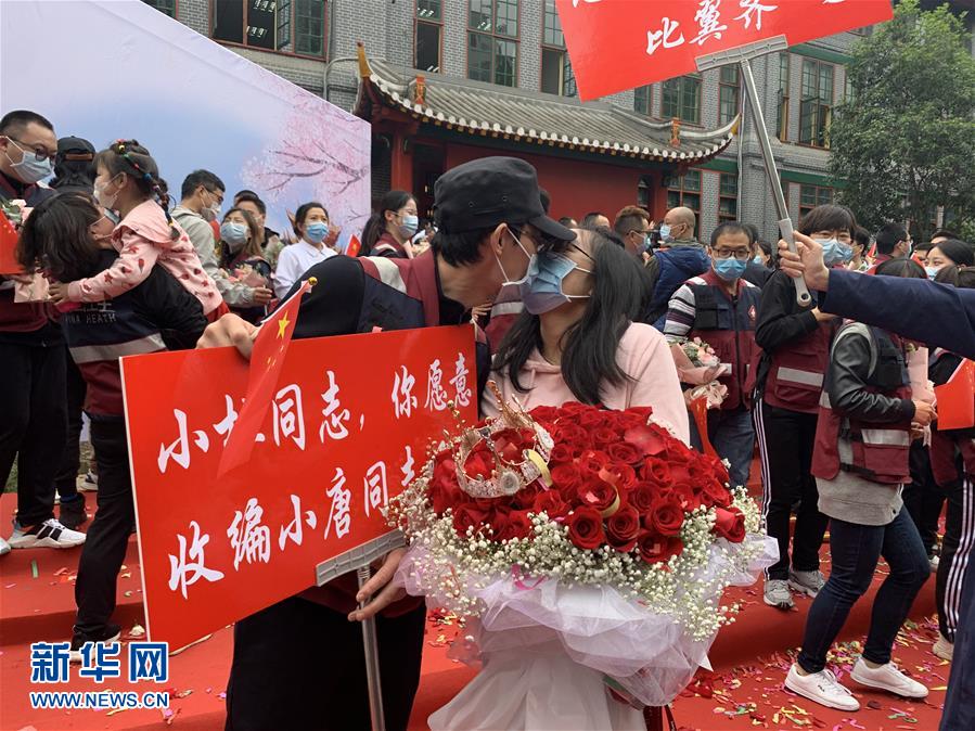 4月21日,在四川大学华西医院,医疗队队员向女友现场求婚。当日,来自四川大学华西医院、华西第二医院、华西第四医院的医疗队队员解除隔离休整,与分别许久的家人、同事团聚,紧紧相拥。新华社记者卢宥伊摄