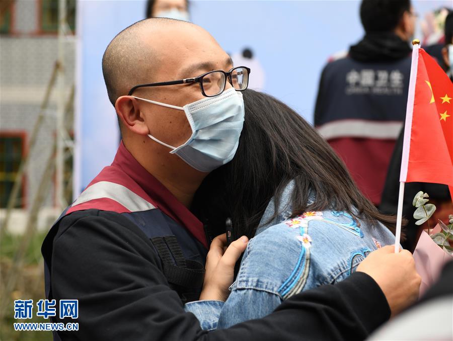 4月21日,在四川大学华西医院,医疗队队员和家人相互拥抱。当日,来自四川大学华西医院、华西第二医院、华西第四医院的医疗队队员解除隔离休整,与分别许久的家人、同事团聚,紧紧相拥。新华社记者王曦摄